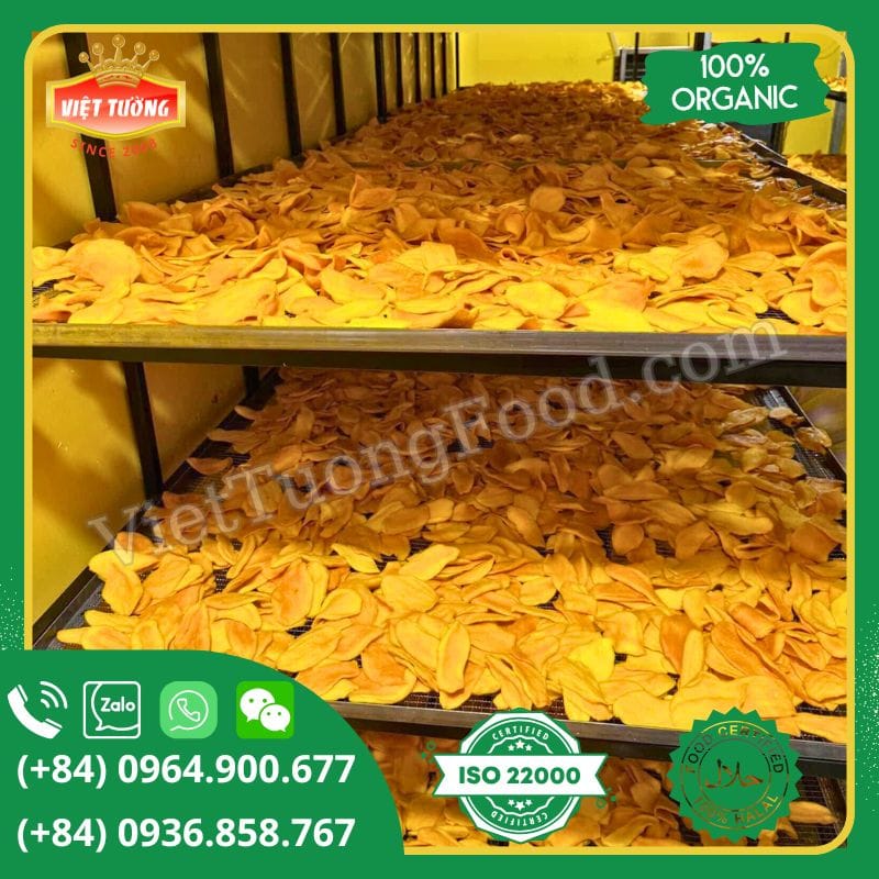 Quy trình sản xuất Xoài Sấy Dẻo Không Đường được VietTuong Food kiểm soát nghiêm ngặt từ khâu lựa chọn nguyên liệu đến thành phẩm. Những trái xoài sau khi thu hoạch sẽ được rửa sạch, gọt vỏ, cắt lát vừa ăn và đưa vào hệ thống máy sấy hiện đại. Điểm đặc biệt và cũng là cam kết của chúng tôi chính là quy trình sấy hoàn toàn “mộc” – không tẩm ướp bất kỳ loại đường hay phụ gia nào khác. Nhờ đó, sản phẩm giữ trọn vẹn vị ngọt tự nhiên, hương thơm đặc trưng và màu vàng óng ả của xoài chín cây.